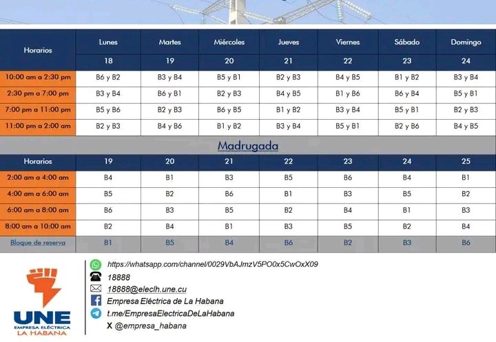 En estos momentos el servicio de electricidad no esta funcionando en El Vedado (B4), la Habana. Vuelva a interntarlo mas tarde, para mas información puede consultar los horarios de suministro en el siguiente cuadrante, gracias.